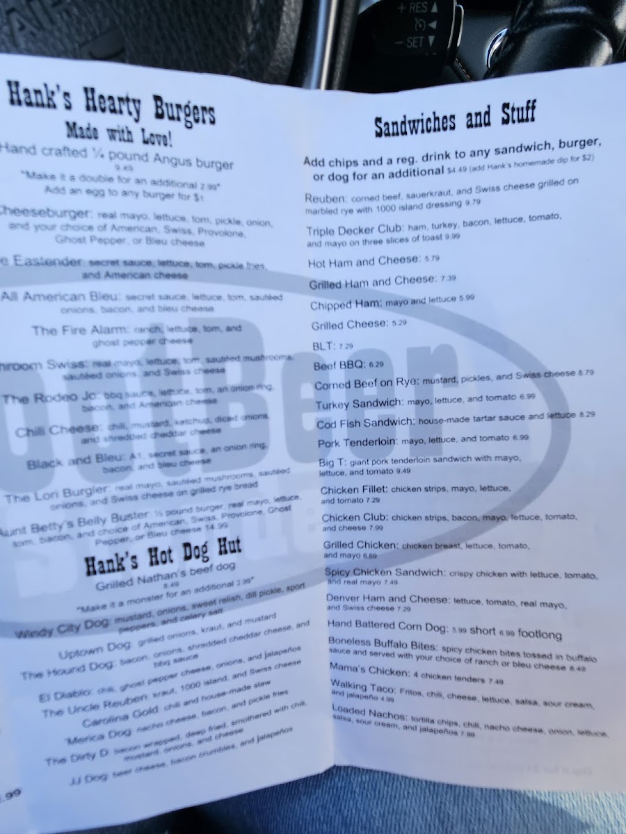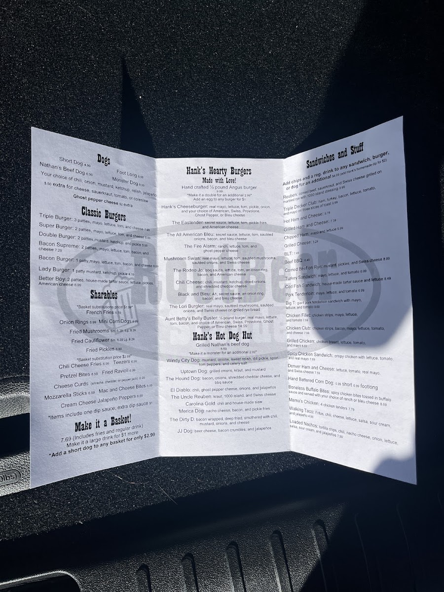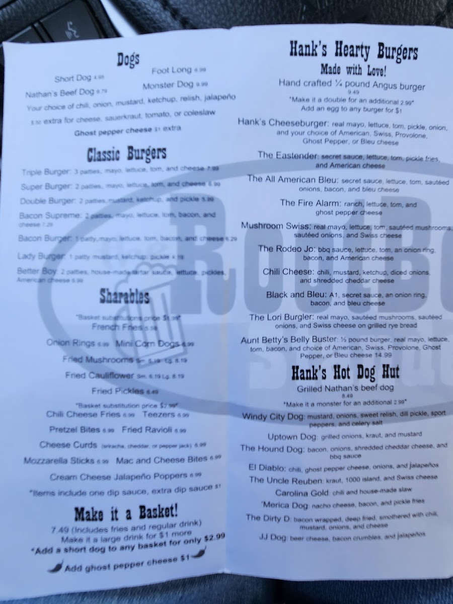 Hank's burger patty topped with bacon and american cheese, sandwiched between two grilled cheese sandwiches, served with served with secret sauce.